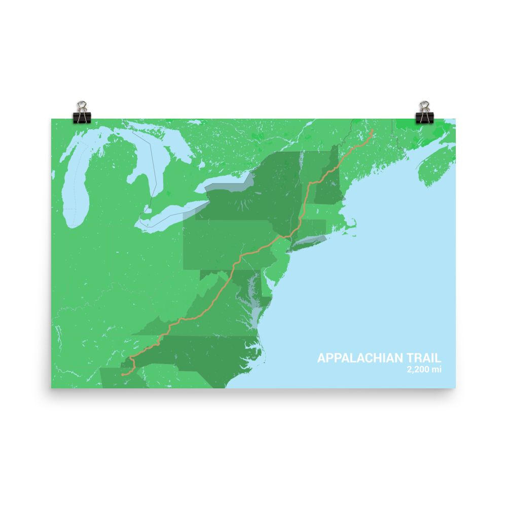 The Appalachian Trail stretches more than two thousand miles along the Eastern United States and brings people to some of the most beautiful sights in the country. Commemorate this special part of the country with our Appalachian Trail map. This trail art print displays the entire route as it goes from Georgia to Maine. Look as the route makes its way through almost every state on the East Coast. This AT map is a great souvenir to commemorate a trip to a part of this appealing route. It might also inspire you to find a great place on the trail worth traveling up to.