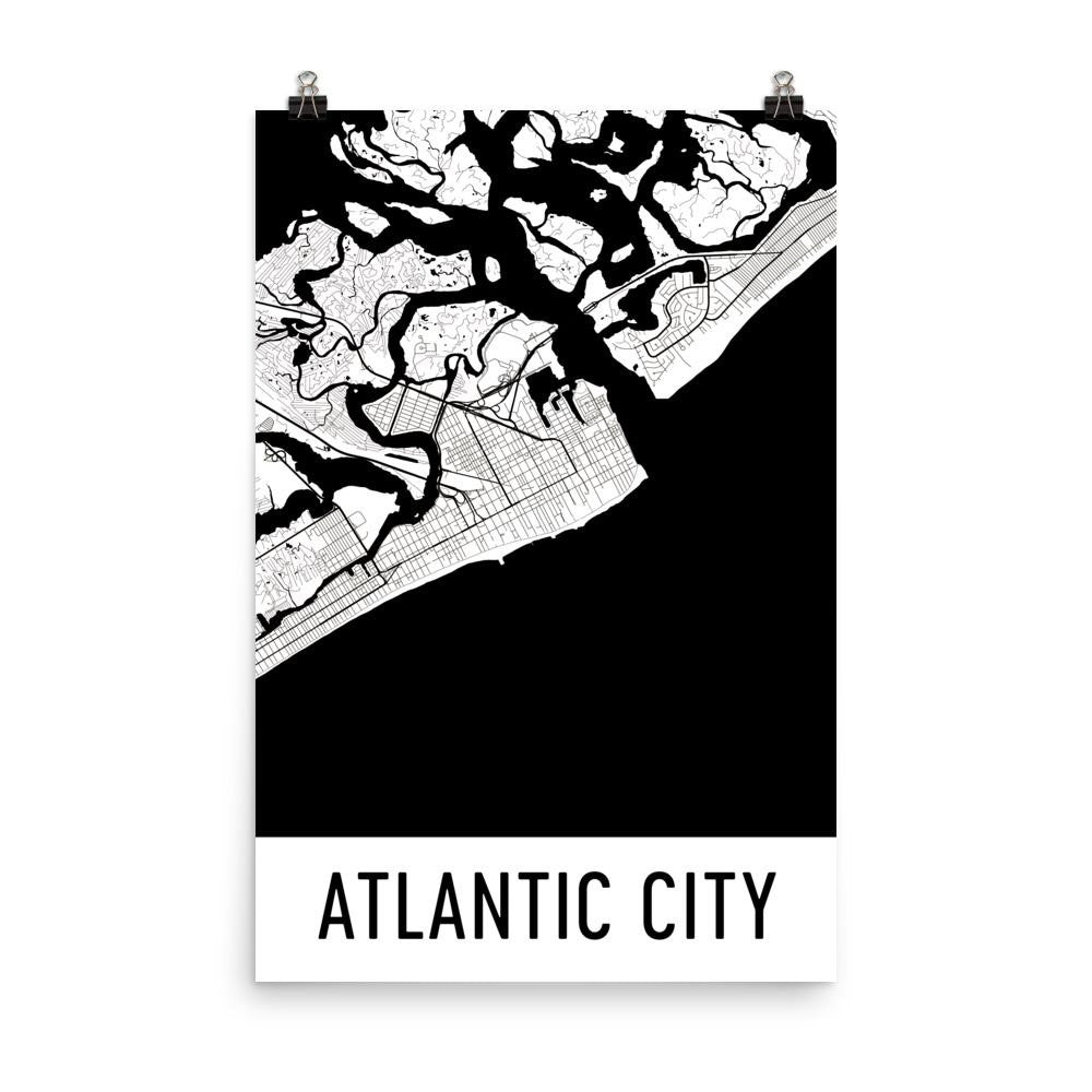 Atlantic City street map prints are great souvenirs of a trip to this historic part of New Jersey. Look around the Boardwalk and find your favorite casinos. See Boardwalk Hall from high up while the many streets that were made famous by Monopoly can be seen all around the map art print.