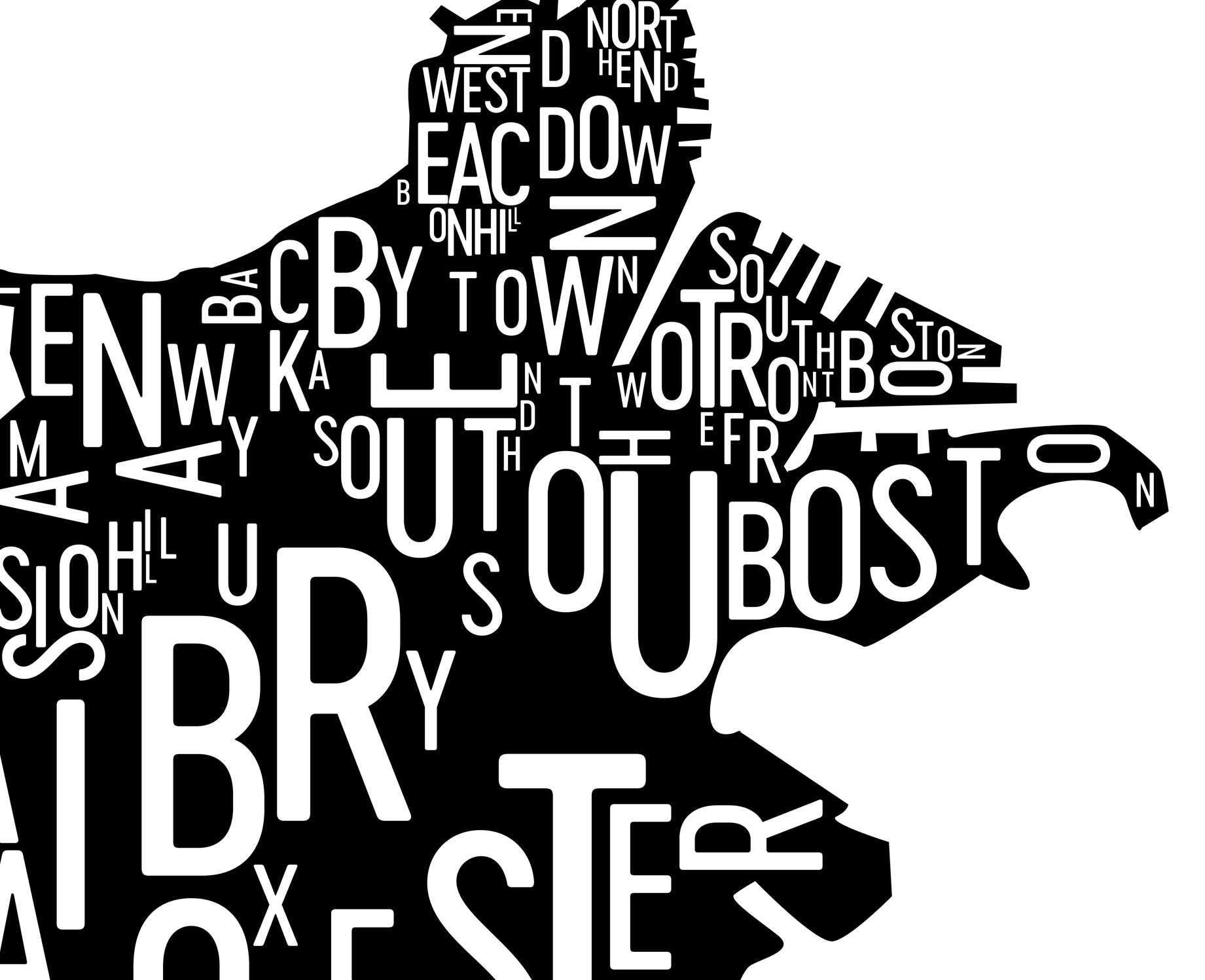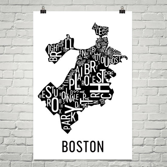 Boston is a historic city with its own distinct culture. This culture is on display throughout our Boston neighborhood typography map art city prints. See how the city is laid out as the borders move along the waterway. Look as the typography lists all the neighborhoods of the city including Roxbury, Jamaica Plain, Back Bay and Beacon Hill. These historic regions of the city are displayed with numerous letters in varying sizes to create a more distinct layout. Our art posters are ideal gifts for anyone who loves the city and are especially perfect for students and alumni from the prominent schools found around the city.