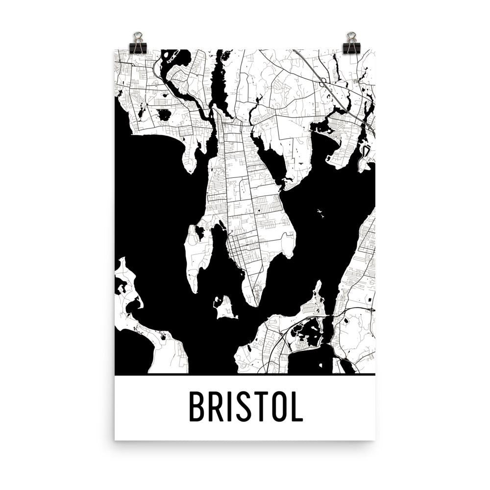 This street map features markings of all the roads and major bodies of water all around Bristol Rhode Island. This décor product features thousands of street lines and several bodies of water both big and small. Look all around to find your favorite landmarks around the city as you follow the highways, waterways and even rail or mass transit system lines. The poster will remind you of the many beautiful things that you will see all around the city.