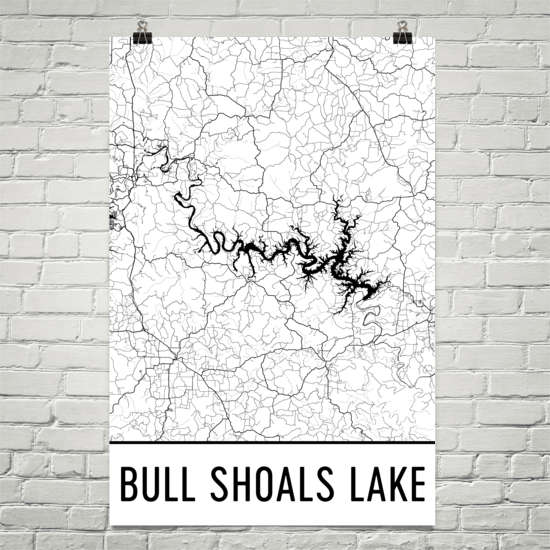 The Bull Shoals Lake is illustrated on this modern art piece as it moves through Missouri and Arkansas alike. Watch as the lake forms off of the White River. The curves and inlets of the lake are all perfectly on display on this art print. Look for various roads as they scatter around the lake with a few moving into the resort town of Branson to the northwest. This Bulls Shoals Lake gift is great for those who have traveled to the region or those who might have made a day trip out from Branson to see this special wonder of Missouri and Arkansas in action.