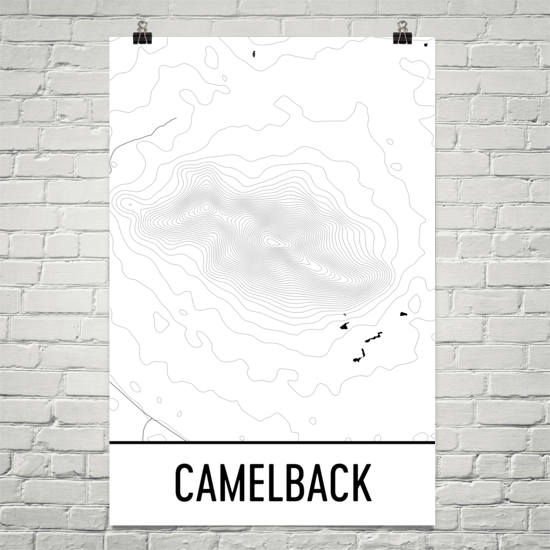 Our Camelback Mountain print shows the distinct mountain as it stands out just outside the Phoenix area. Watch as the contour lines illustrate how the mountain moves up about 2,700 feet in elevation. The curves move all around from east to west. See where the Echo Canyon Recreation Area is located while the Echo Canyon Bowl is situated not too far off. Look for the extensive tennis ranch to the north. Our Camelback Mountain poster gift is a beautiful hiking gift for anyone who has gotten up to this mountain to see and to have in one’s home or office.