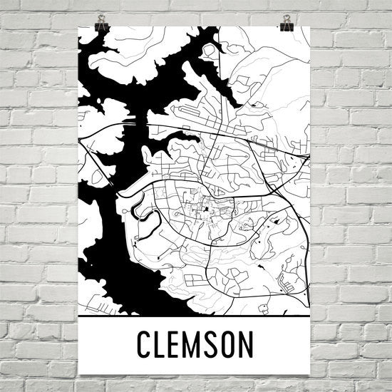 This street map features markings of all the roads and major bodies of water all around Clemson. This décor product features thousands of street lines and several bodies of water both big and small. Look all around to find your favorite landmarks around the city as you follow the highways, waterways and even rail or mass transit system lines. The poster will remind you of the many beautiful things that you will see all around the city.
