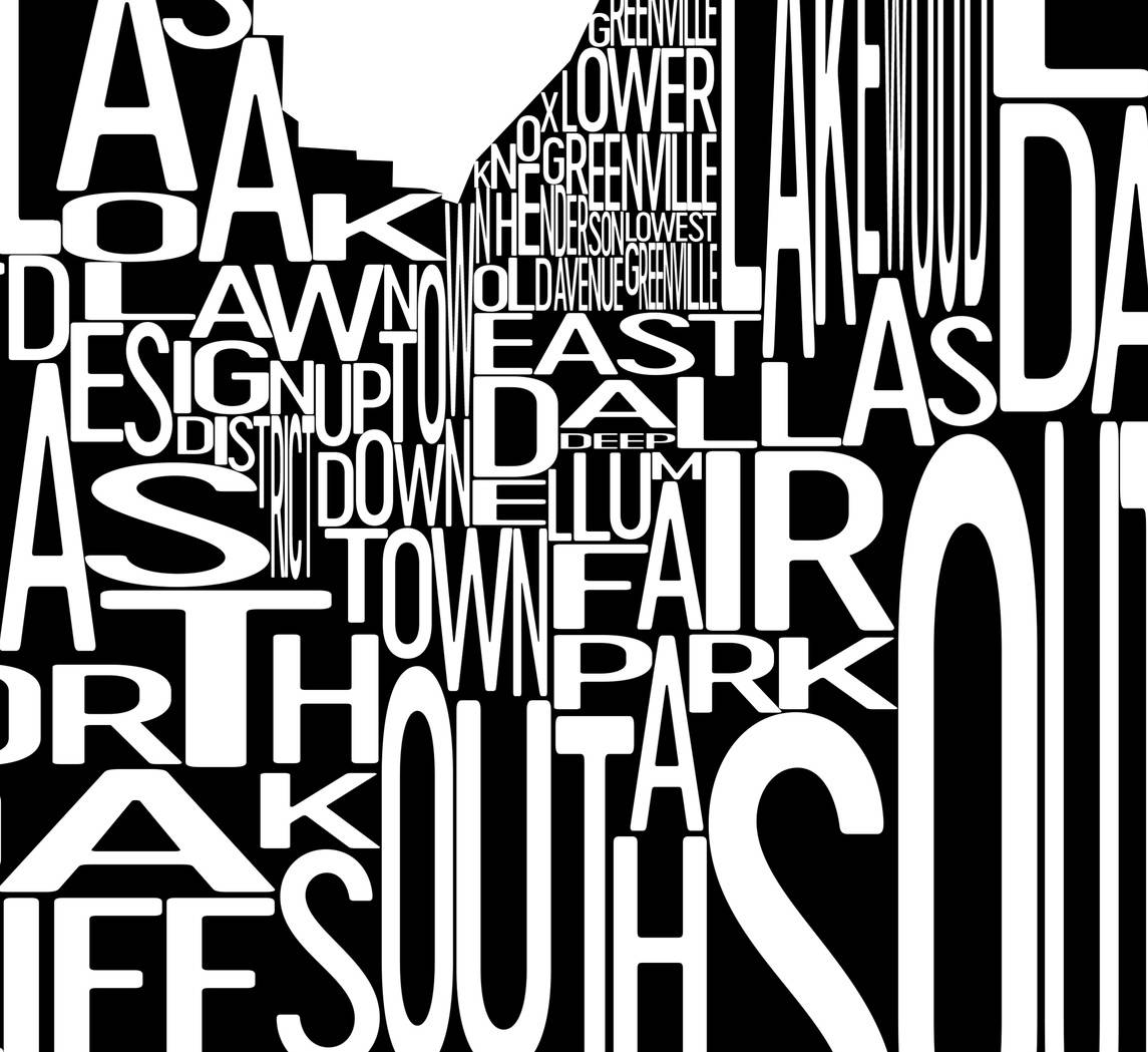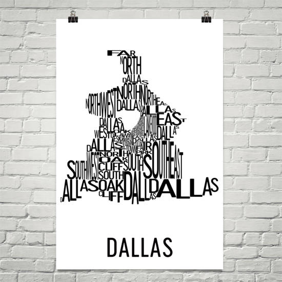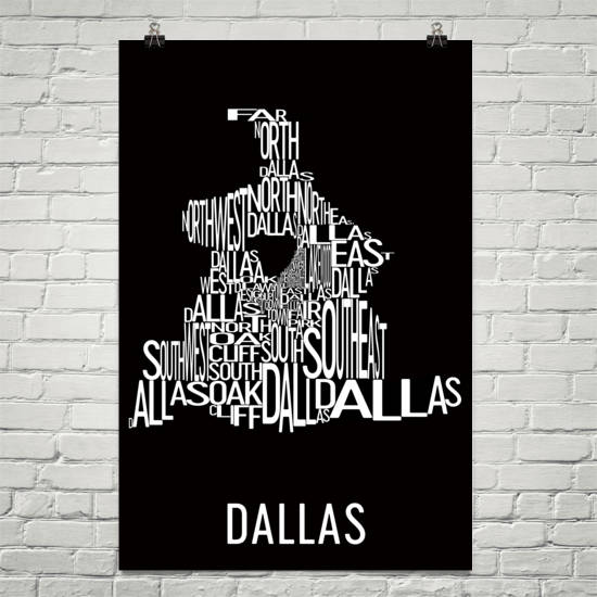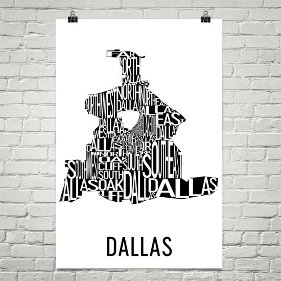 This Dallas neighborhood typography map art city print has a great design that shows off the cowboy hat-like shape of the Dallas city limits. Inside the layout is typography layout that spells out the many neighborhoods of the city. Look for the south and north ends of the city plus Trinity Groves, Deep Ellum, West End and many other iconic spots. The strong layout of the city and the dynamic print design makes this one of the most intriguing works of art you could show off in your home. Our print is a great gift for college students studying in the area or people who have lived in Big D in the past.