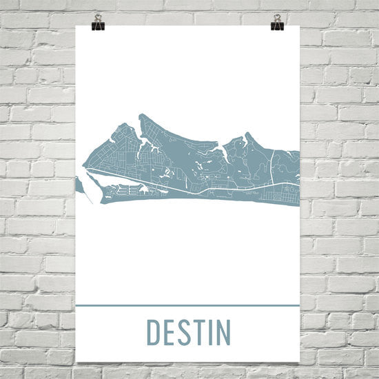 The slender body of Destin is on full display on your map art print. All of our street map décor products for the home include shots of the Boardwalk, Henderson Beach and much more. Look for the Big Kahuna water park and the Indian Bayou country club when looking around your gift.