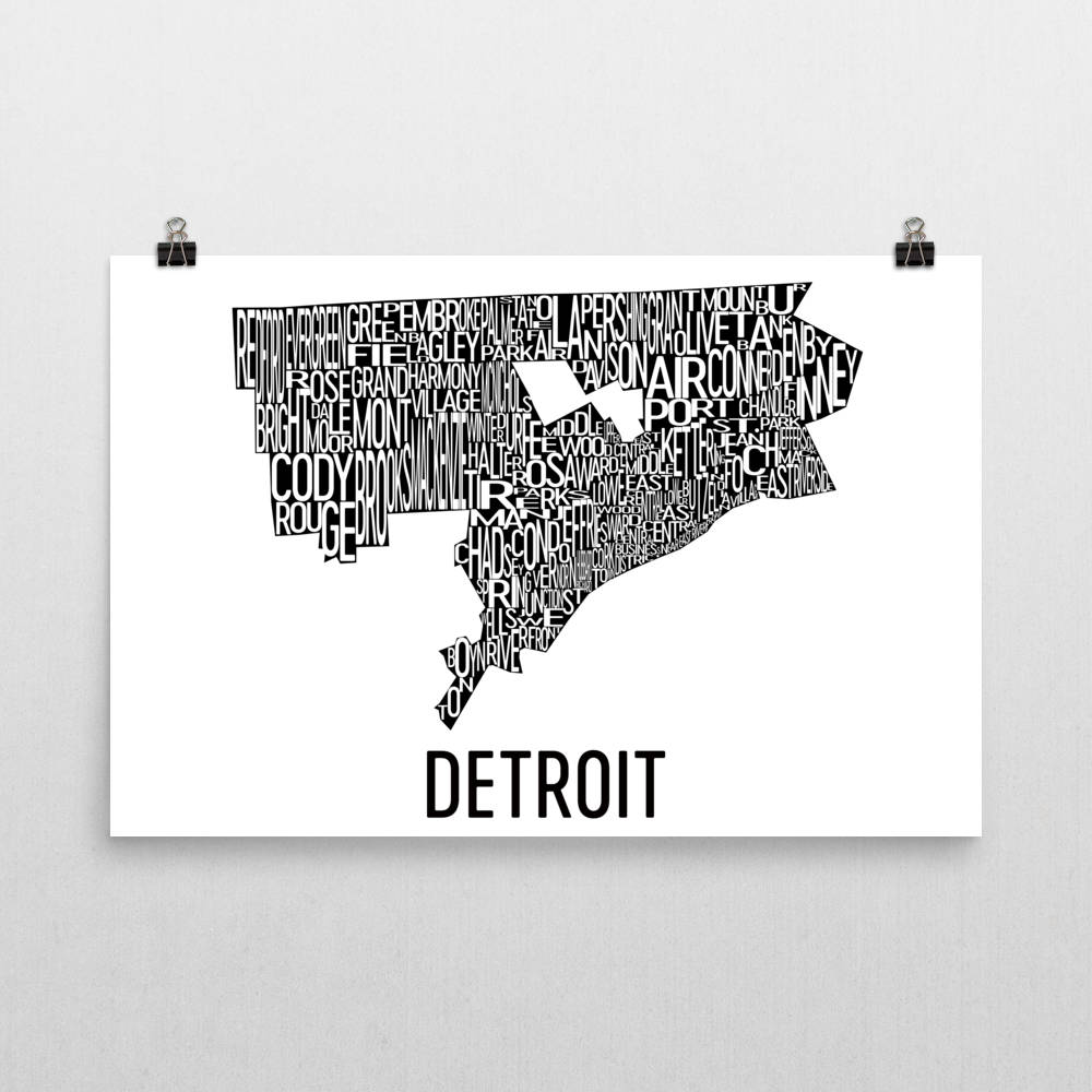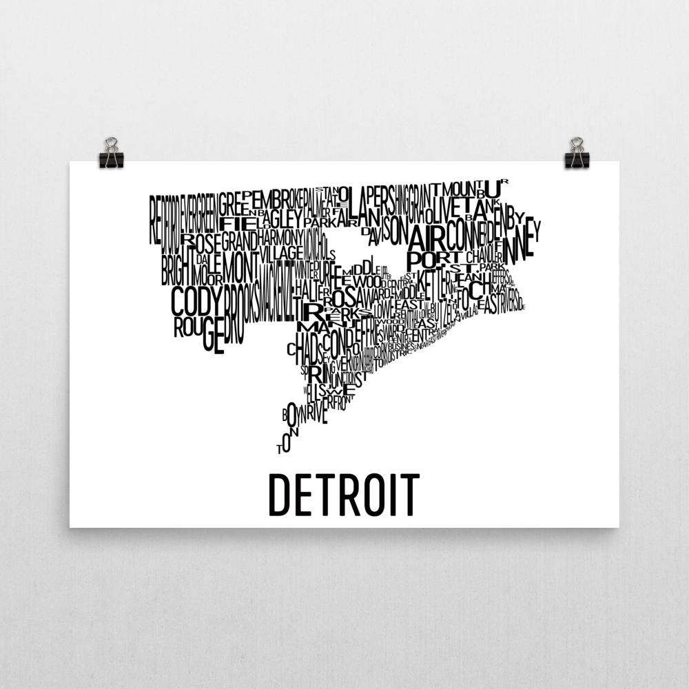 See the many neighborhoods of the Motor City on our Detroit art poster gifts. Each piece of Detroit artwork shows the city as it curves its way along the Detroit River to the south. See all the vital neighborhoods of the city including Woodbridge, Rivertown, Nortown and City Airport among other spots. Each place is marked with a series of letters placed along the spots that they are located in. This all comes with the unique layout of the city on full display with even the Highland Park and Hamtramck cutouts included in the middle. This print shows Motown in all of its glory.