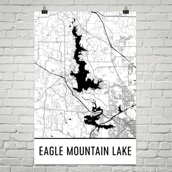 Head northwest of Fort Worth to see Eagle Mountain Lake in all its detail. Our Eagle Mountain Lake art décor print shows off the full layout of this lake as it moves to the north. Every small island formed around the lake can be seen on this art print. Look for some of the highways in the region that go along the lake and move into Fort Worth and eventually Dallas. See the Eagle Mountain Park around the eastern half with Pelican Bay across the way. This is a fine Texas décor print to have in your cottage or lake house around the area.