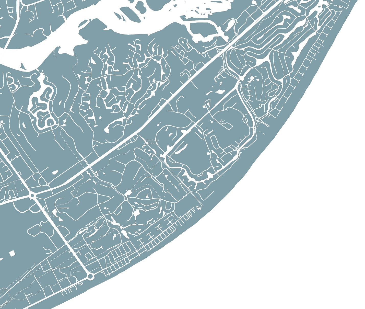 The lively Lowcountry is alive on this Hilton Head Island street map art design. A great look of the many roads around this great part of South Carolina is the key highlight on this design. Look for the lighthouses and the beaches while the Pinckney Island refuge stands out near the north.