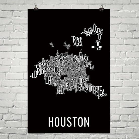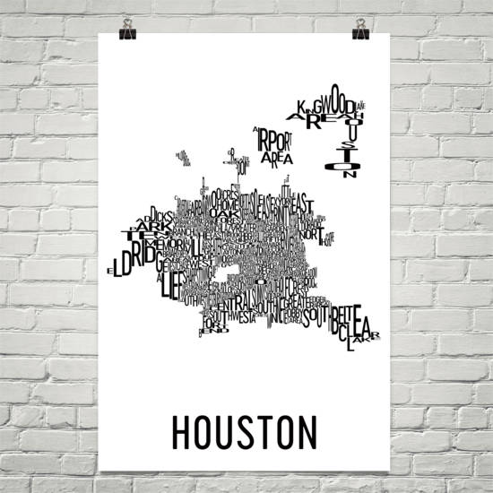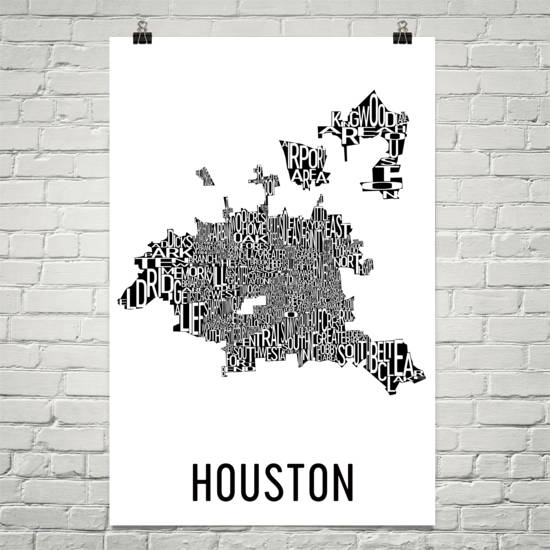 Look as the neighborhoods of Houston come alive on your Houston wall art print. This Houston neighborhood typography map art city print shows a layout featuring all the regions of the city in a beautiful typography-based look. Each neighborhood is listed with its name in its approximate location. The entire Houston city layout is included with even the non-contiguous sports on the north on display. Look at Kingwood, Spring Branch and even the area surrounding the George Bush airport. This attractive Houston wall art piece is a great gift for people from the city and those who have fond memories of the many spots that make it special.