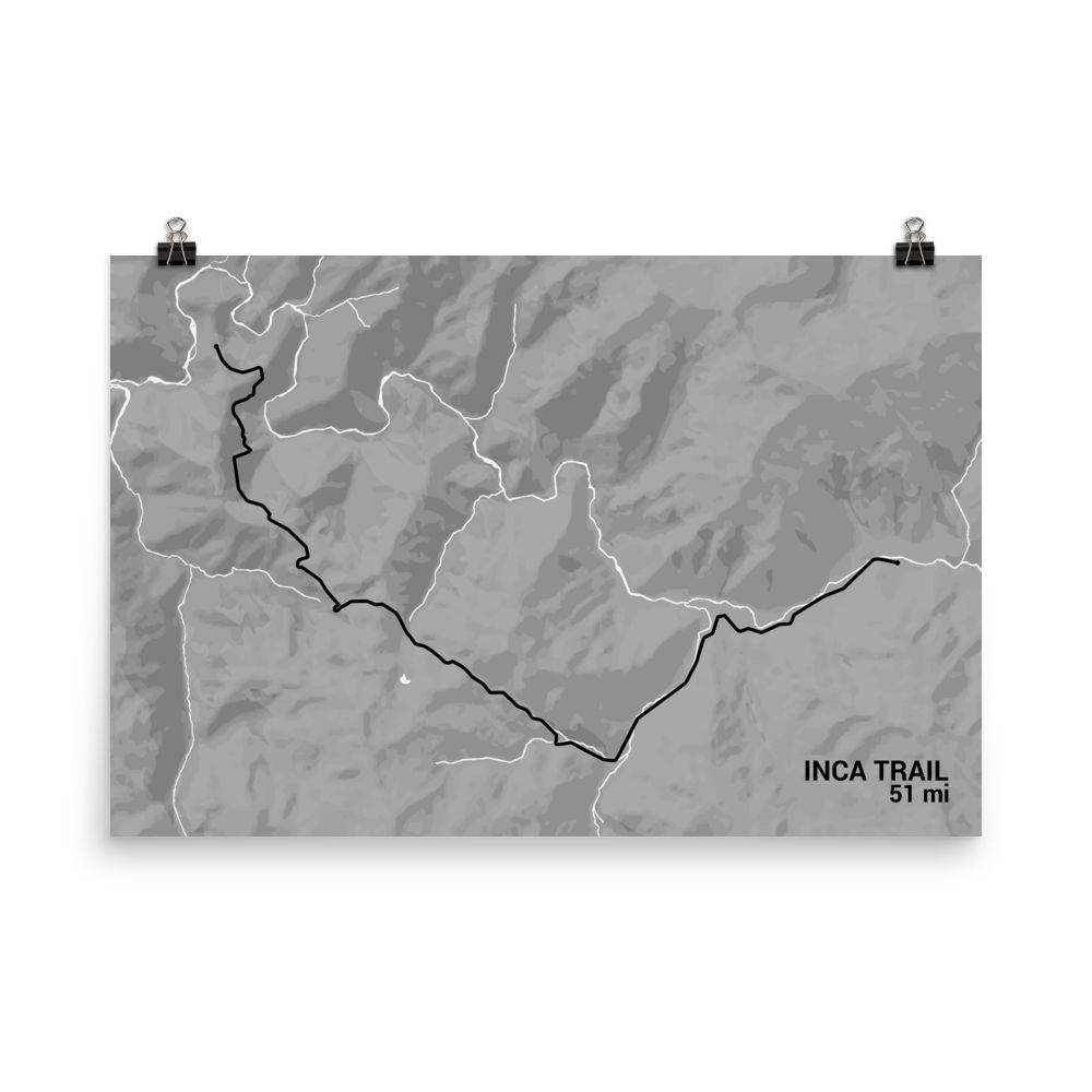 The Inca Trail is a route to Machu Picchu that will leave memories that will last a lifetime to anyone who travels its 51-mile path. This Inca Trail map shows the full route in all its detail. See how the trail is laid out with much of it being based off of old Incan construction sites. Watch as the route heads along many ruins of Incan culture and many beautiful forests. Look as the rivers in the region spread around the area to add a fine look all around. This map art print is a great gift to have to commemorate a trip to the region with.