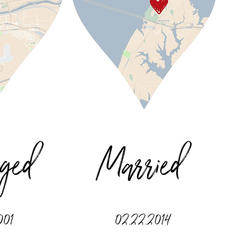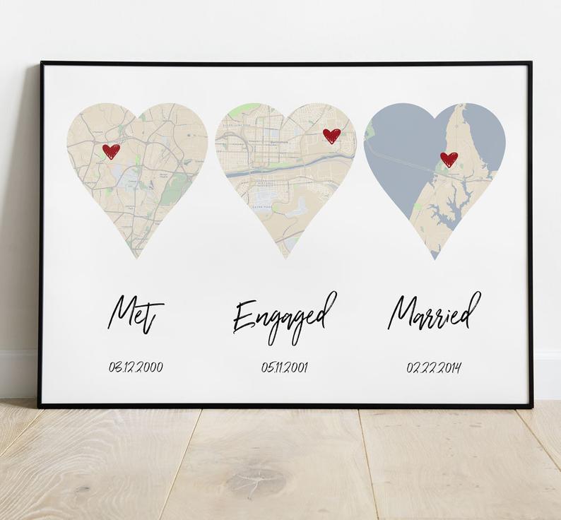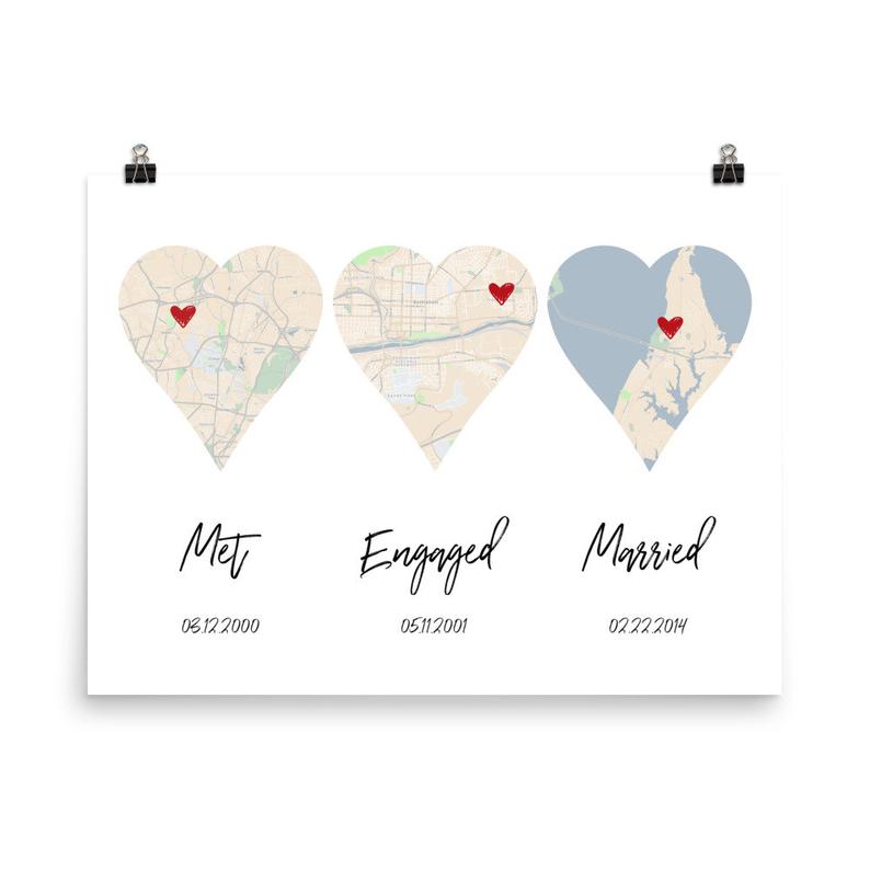 This is a anniversary gift that features three hearts illustrating important moments in your life. The first heart shows where and when you and your loved one first met. The second highlights when and where you got engaged, and the third shows where you go married. All three parts offer a fine appearance with a smaller heart in the middle of each one to show the specific spot where these three important moments in your life took place at. This is an easy to customize print as you can let us know about the dates and places of all three events. We will create a memorable customized print based on what you send us.