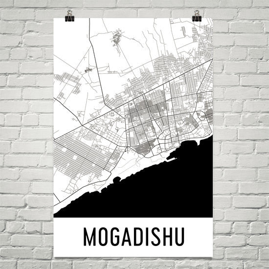 The historic value of Somalia makes this map art print a unique one to have in your home. This Mogadishu street map displays the ports around the coastline that have been used for thousands of years. Look around and see where the boats take off and come in. This is paired with many roads heading into the land.