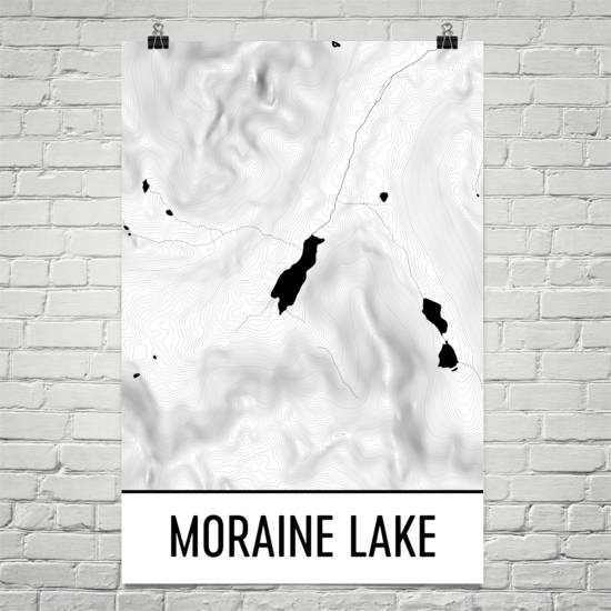 The scenes surrounding Moraine Lake not far from Lake Louise in the Banff National Park are among the most memorable things that anyone will ever see in their lives. This Moraine Lake map print shows the full layout of the lake alongside many topographic surroundings. Look as Panorama Peak and Eiffel Peak surround the area while the border between Alberta and British Columbia stretch along to the south. Order this Moraine Lake print as a fine souvenir of a trip to this memorable and iconic part of Canada. It will remind you of boating trips around this beautiful part of the Banff park.