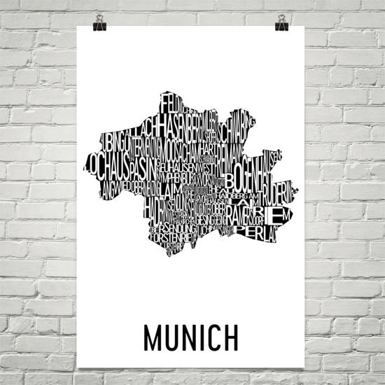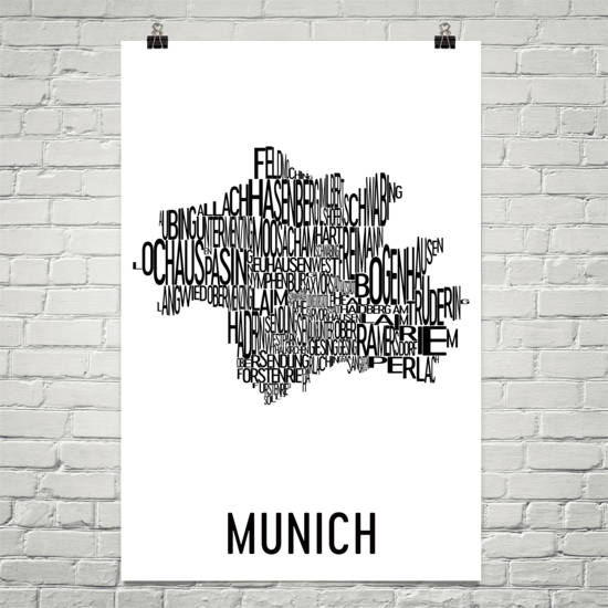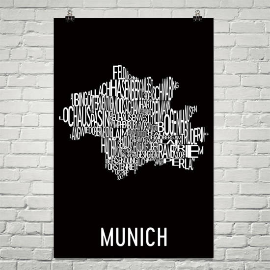 Munich is an outstanding part of Germany which features many great architectural wonders and numerous modern tech centers. Our Munich art poster prints show the names of the various neighborhoods of the city. Each neighborhood is listed with various letters in many sizes. These are laid out around the city border outline. Every neighborhood is positioned in the right spots based on where they are located within the city. The design gives off an awesome modern look that is as attractive and distinct as the city of Munich itself. It is an ideal souvenir to remember the city by after a trip to this place.