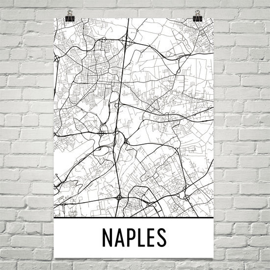 This street map features markings of all the roads and major bodies of water all around Naples. This décor product features thousands of street lines and several bodies of water both big and small. Look all around to find your favorite landmarks around the city as you follow the highways, waterways and even rail or mass transit system lines. The poster will remind you of the many beautiful things that you will see all around the city.