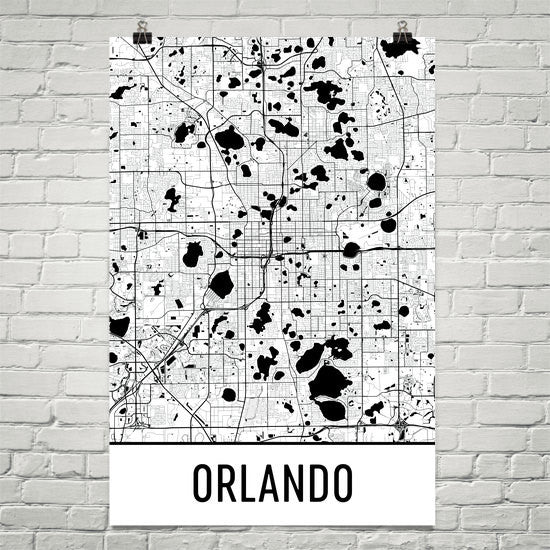 This street map features markings of all the roads and major bodies of water all around Orlando . This décor product features thousands of street lines and several bodies of water both big and small. Look all around to find your favorite landmarks around the city as you follow the highways, waterways and even rail or mass transit system lines. The poster will remind you of the many beautiful things that you will see all around the city.