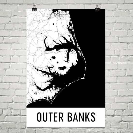 This street map features markings of all the roads and major bodies of water all around Outer Banks. This décor product features thousands of street lines and several bodies of water both big and small. Look all around to find your favorite landmarks around the city as you follow the highways, waterways and even rail or mass transit system lines. The poster will remind you of the many beautiful things that you will see all around the city.