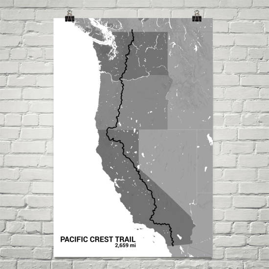 The beauty of the Sierra Nevada and the Cascade Range make the Pacific Crest Trail a beautiful place to head out on. This Pacific Crest Trail map displays the full layout of the trail as it goes from right outside the border with Mexico to just into Canada. This modern art print displays the full layout of the trail. See the many lakes that pop up around the trail with Lake Tahoe standing out just east of the route. Every curve on the trail is depicted. This national scenic trail map is a great gift for anyone who has traveled out on this trail in the past.