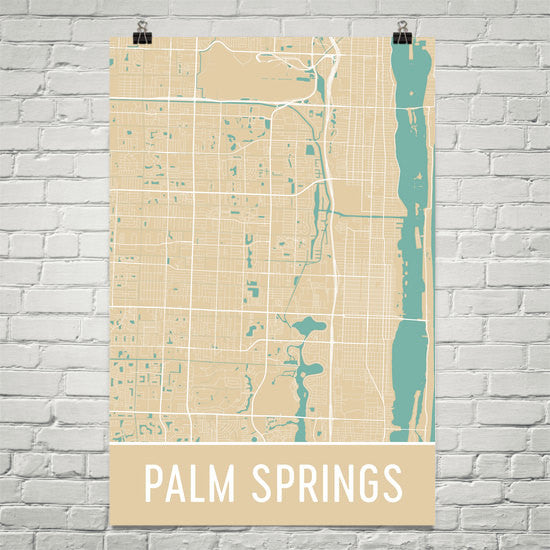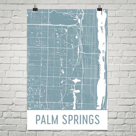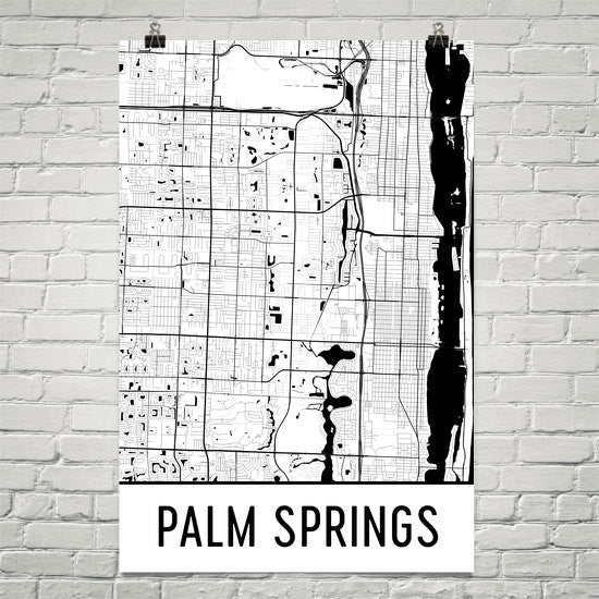 This street map features markings of all the roads and major bodies of water all around Palm Springs. This décor product features thousands of street lines and several bodies of water both big and small. Look all around to find your favorite landmarks around the city as you follow the highways, waterways and even rail or mass transit system lines. The poster will remind you of the many beautiful things that you will see all around the city.