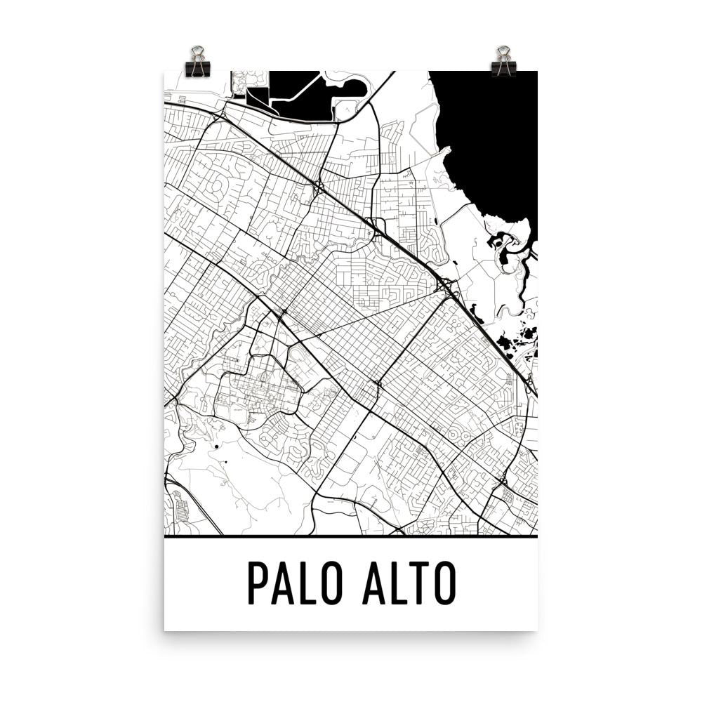This street map features markings of all the roads and major bodies of water all around [Palo Alto . This décor product features thousands of street lines and several bodies of water both big and small. Look all around to find your favorite landmarks around the city as you follow the highways, waterways and even rail or mass transit system lines. The poster will remind you of the many beautiful things that you will see all around the city.