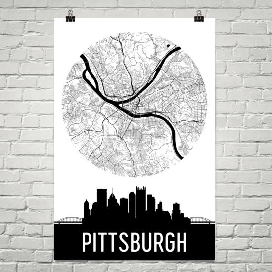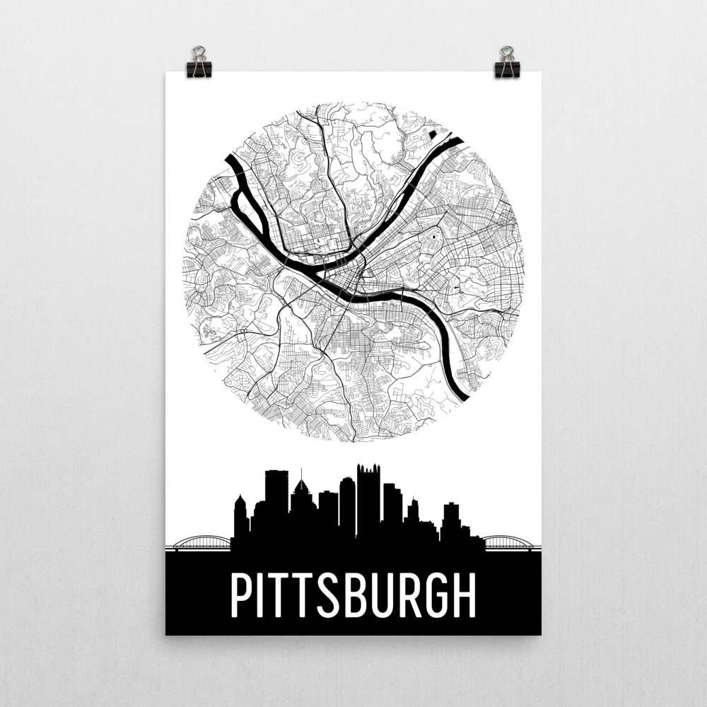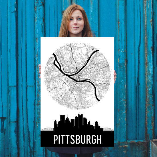 The intriguing Pittsburgh skyline is highlighted on this modern map art print. Look as a few of the key bridges in the city are formed along the sides while many distinct buildings appear. See the crown-like top of One PPG Place while the peak of Fifth Avenue Place stands out nearby. Go up to the top of the print to see the three rivers that converge upon Pittsburgh. Look around the streets to find some of your favorite bridges as well as the big baseball and football stadiums on the riverfronts. The fine design of this print is perfect for anyone from the Steel City to have in one’s home.