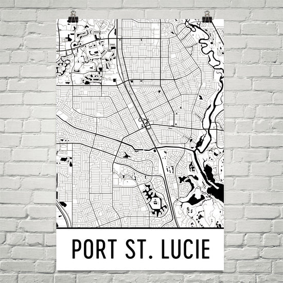 This street map features markings of all the roads and major bodies of water all around Port St. Lucie . This décor product features thousands of street lines and several bodies of water both big and small. Look all around to find your favorite landmarks around the city as you follow the highways, waterways and even rail or mass transit system lines. The poster will remind you of the many beautiful things that you will see all around the city.