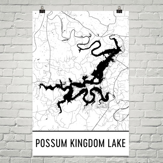The Possum Kingdom Lake in rural Texas has one of the most distinct shapes you will find out of any body of water in the Lone Star State. This Possum Kingdom Lake art display shows every curve of the river in all its detail. Watch as the fully accurate layout of the lake is depicted with the state park around the southern part. Look for the Brazos River as it forms off of the northern end and then leaves from the southeast. You can also see local route 16 and many other local roads on this print as it depicts the lively area around the lake.