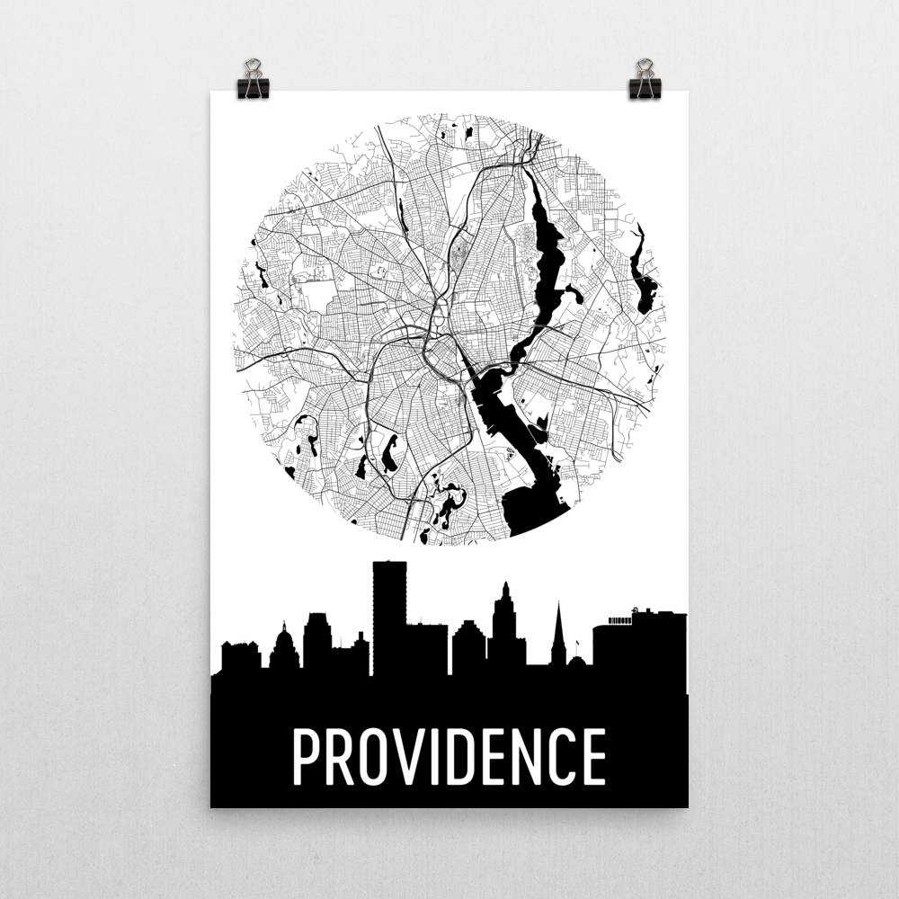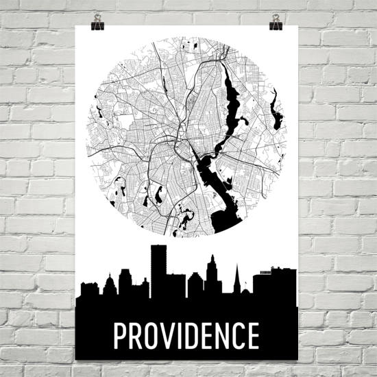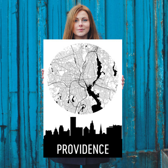 The beauty of Rhode Island’s capital is highlighted on this Providence skyline art print. Look as the city’s landscape is displayed on a full map featuring the College Hill neighborhood. Watch for the inlets as they move their way into the city. The bottom part features the skyline that includes the Industrial National Bank Building with its distinct limestone body. The large pillar and statue outside the county courthouse can be seen too as well as the influential Turk’s Head Building with its Flatiron Building-like appearance. The fine look of this art print makes it a special gift for anyone from Rhode Island to have.