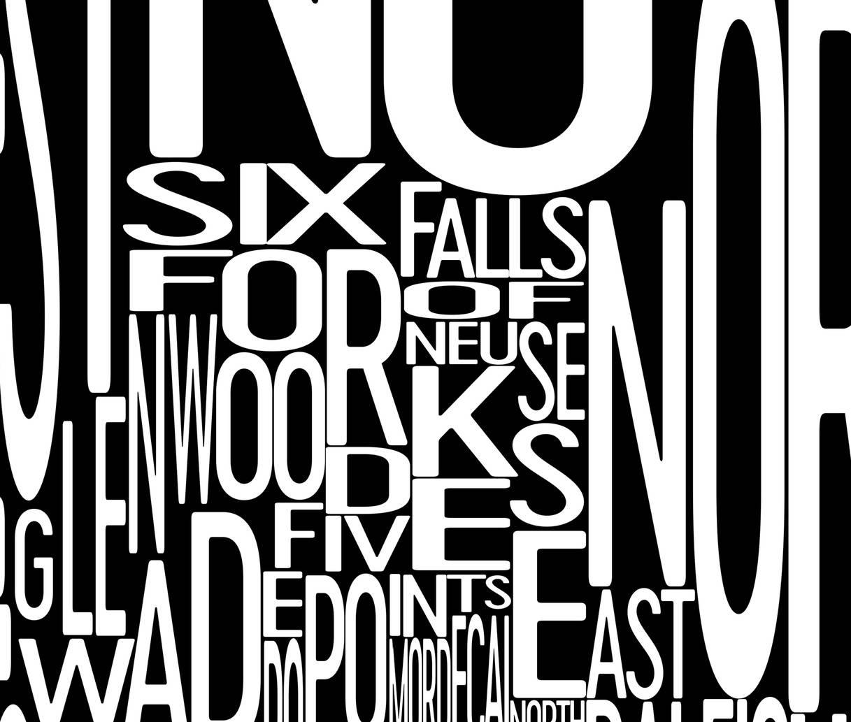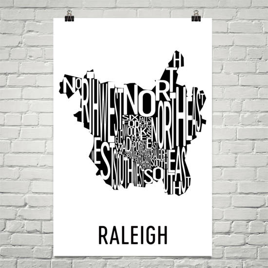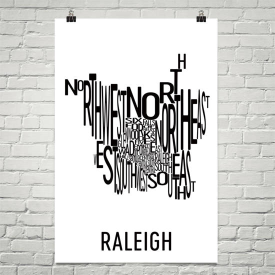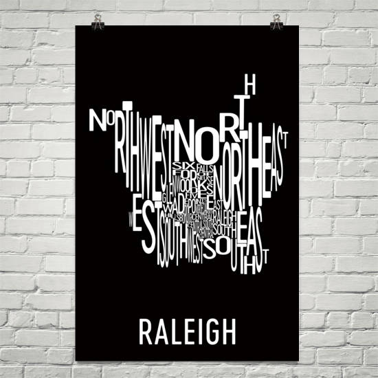 See the many neighborhoods of the City of Oaks as they spread out on your Raleigh art poster. This map of Raleigh displays the city’s many neighborhoods with a typography-based layout. All of the letters fit perfectly within the Raleigh city limits. Look on the outside part to see the main northwestern and southeastern regions of the city or go inside and see Five Points, Falls of the Neuse and Six Forks among other distinct neighborhoods. Our Raleigh neighborhood typography map art city prints are outstanding gifts for students who attend one of the numerous prominent schools in the capital city.