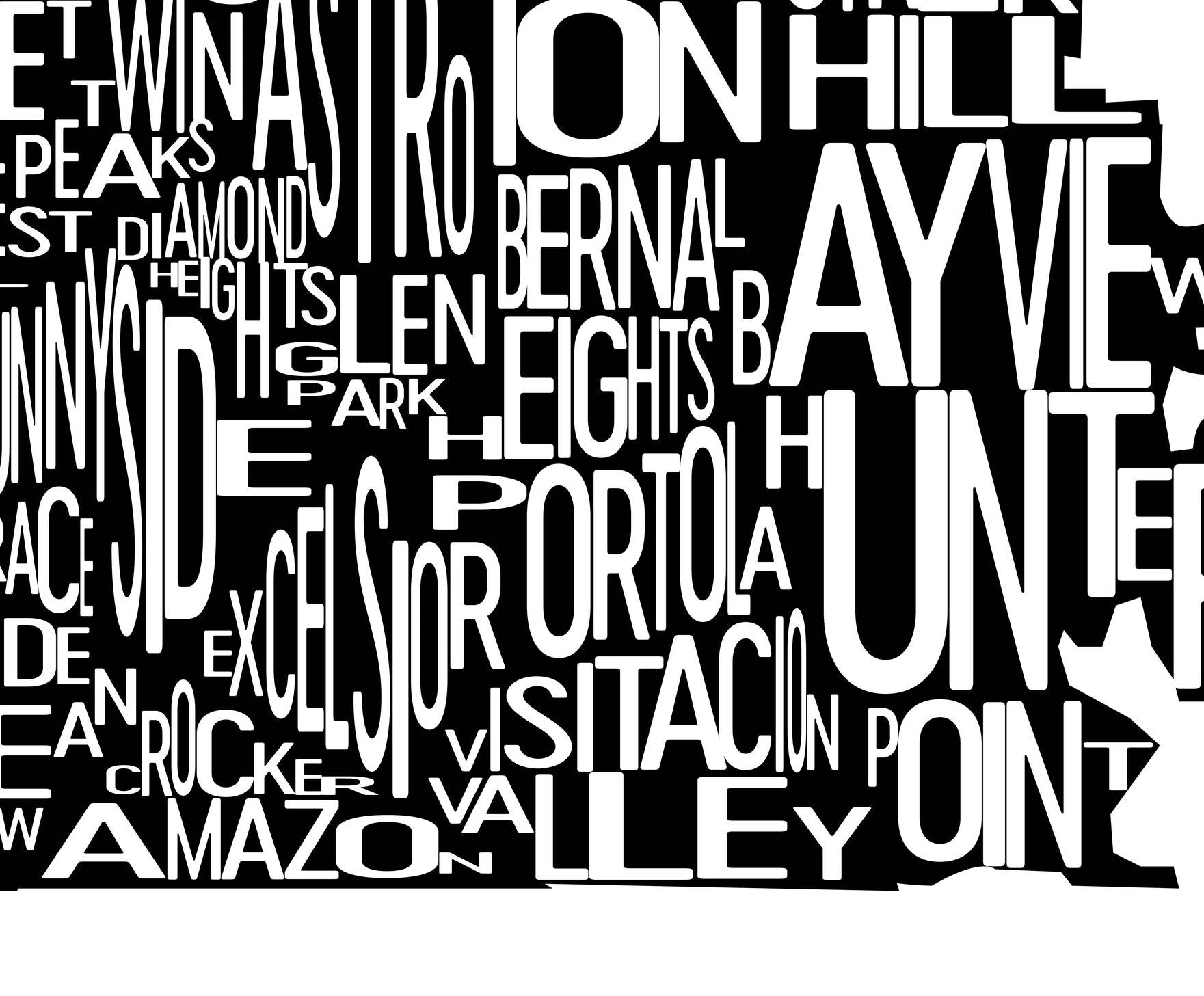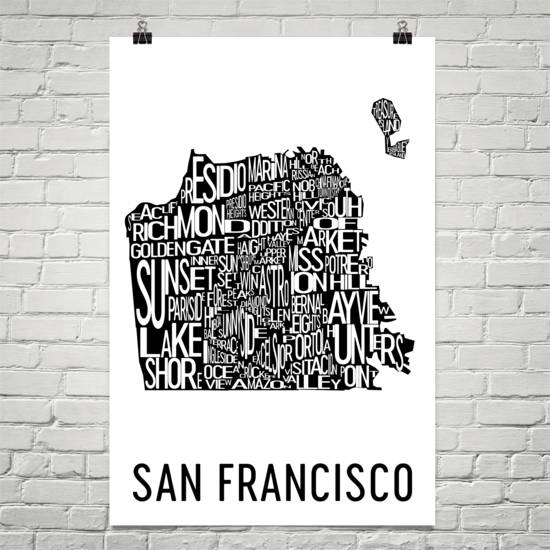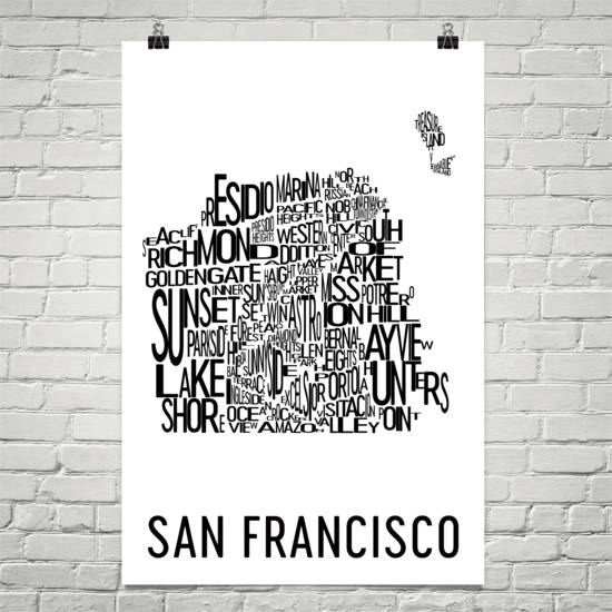 San Francisco is a beautiful city of hills and bridges that no visitor will ever truly forget. Our San Francisco art poster prints will remind you of everything that makes the city memorable. The print offers a typography-based layout with a modern look. Each word on the print is organized within the city’s outline. All the great neighborhoods of the city are highlighted here including Presidio, Haight-Ashbury, Tenderloin, Nob Hill, Russian Hill and even Treasure Island to the northwest. The arrangement on this print shows everything about the city that makes it a unique place for all people to be at.