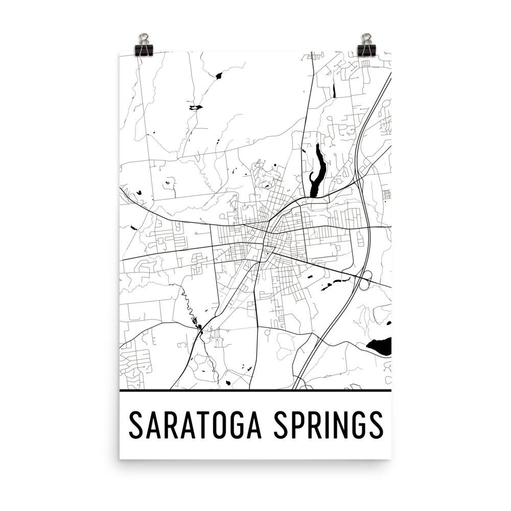 Saratoga Springs street map prints will remind you of this beautiful spot around the Adirondack region of New York. Saratoga Lake is on full display while the Northway moves through the site. This gift is a souvenir of a trip to this beautiful place in upstate New York.