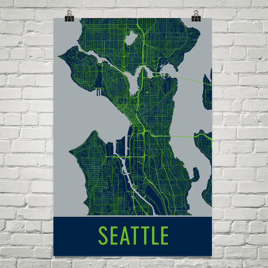 This street map features markings of all the roads and major bodies of water all around Seattle. This décor product features thousands of street lines and several bodies of water both big and small. Look all around to find your favorite landmarks around the city as you follow the highways, waterways and even rail or mass transit system lines. The poster will remind you of the many beautiful things that you will see all around the city.
