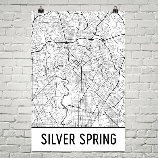 Just north of Washington DC is the great Maryland city of Silver Spring. As you look at your street map print, you will see all the roads and Metro rails along this map art print. See the northern end of the Beltway as it moves along the hundreds of other streets found on your elaborate print.