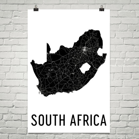 See the African, Dutch and British influences as they come alive on our South African gift print. This South Africa map shows all the important roads that move into many vital cities. Watch as Johannesburg, Pretoria, Bloemfontein and Port Elizabeth shine throughout the landscape. Look at the Kruger National Park to the northeast and the Riemvasmaak Conservancy to the northwest where many exotic native animals can be found. Look for some of the diamond mines around the country including the massive one in Kimberley where modern mining standards were established. This map of South Africa illustrates all the unique features of this country.