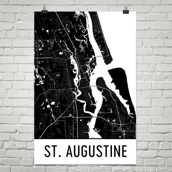 This street map features markings of all the roads and major bodies of water all around St. Augustine. This décor product features thousands of street lines and several bodies of water both big and small. Look all around to find your favorite landmarks around the city as you follow the highways, waterways and even rail or mass transit system lines. The poster will remind you of the many beautiful things that you will see all around the city.