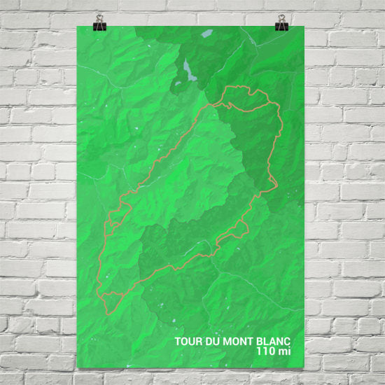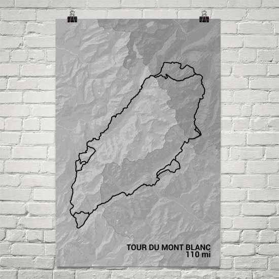 The extensive layout of the Mont Blanc path is highlighted on this French Alps wall art print. Our Tour Du Mont Blanc Trail map shows the full organization of the route with its primary path and all its alternate routes on display. The shaded areas show you the parts of the trail that are in Switzerland, France and Italy. You can even see some parts of the trail that are used for an annual ultramarathon where people travel more than a hundred miles in a day. This Tour Du Mont Blanc poster is a fine souvenir to have following a trip to the trail.