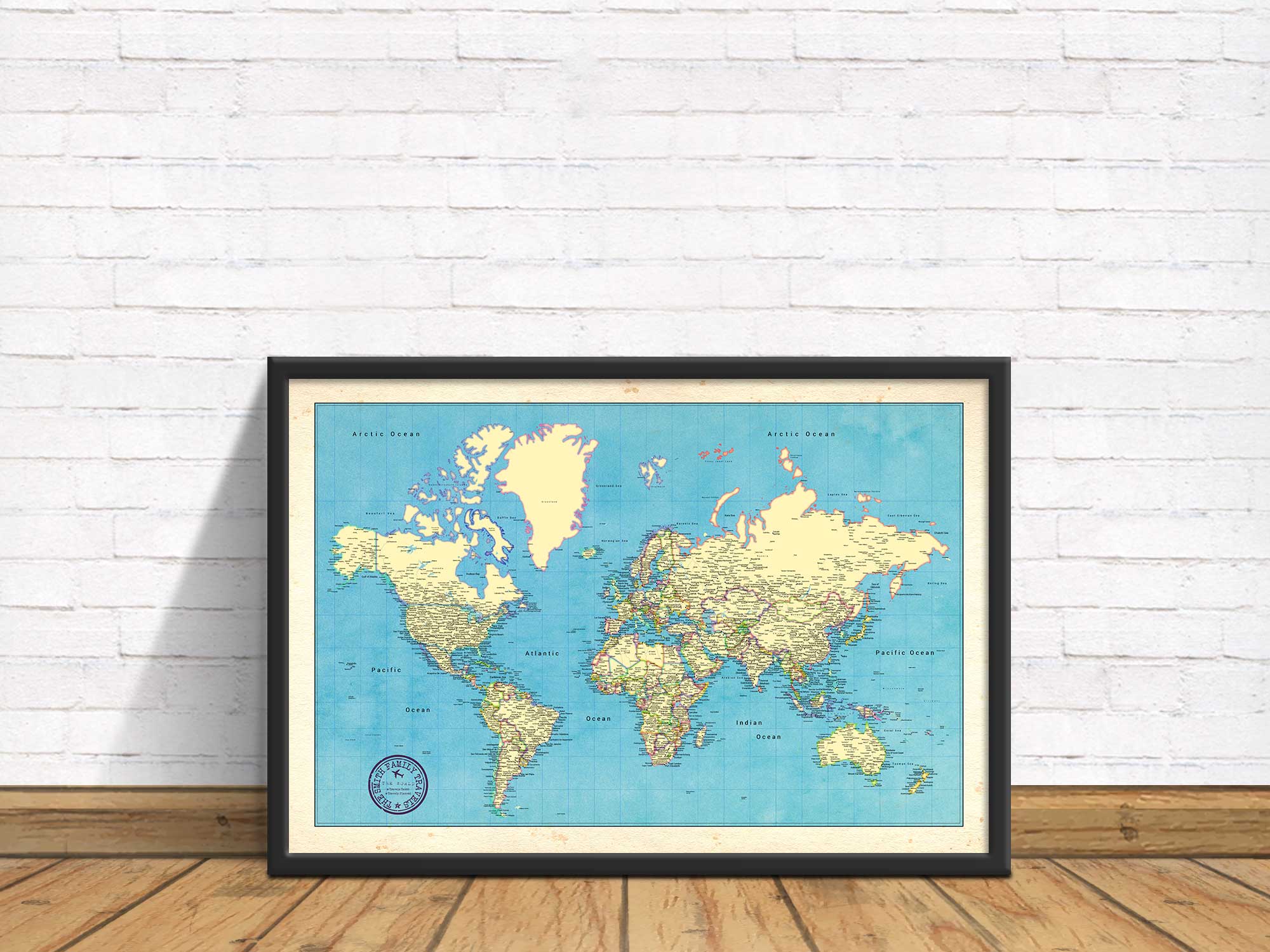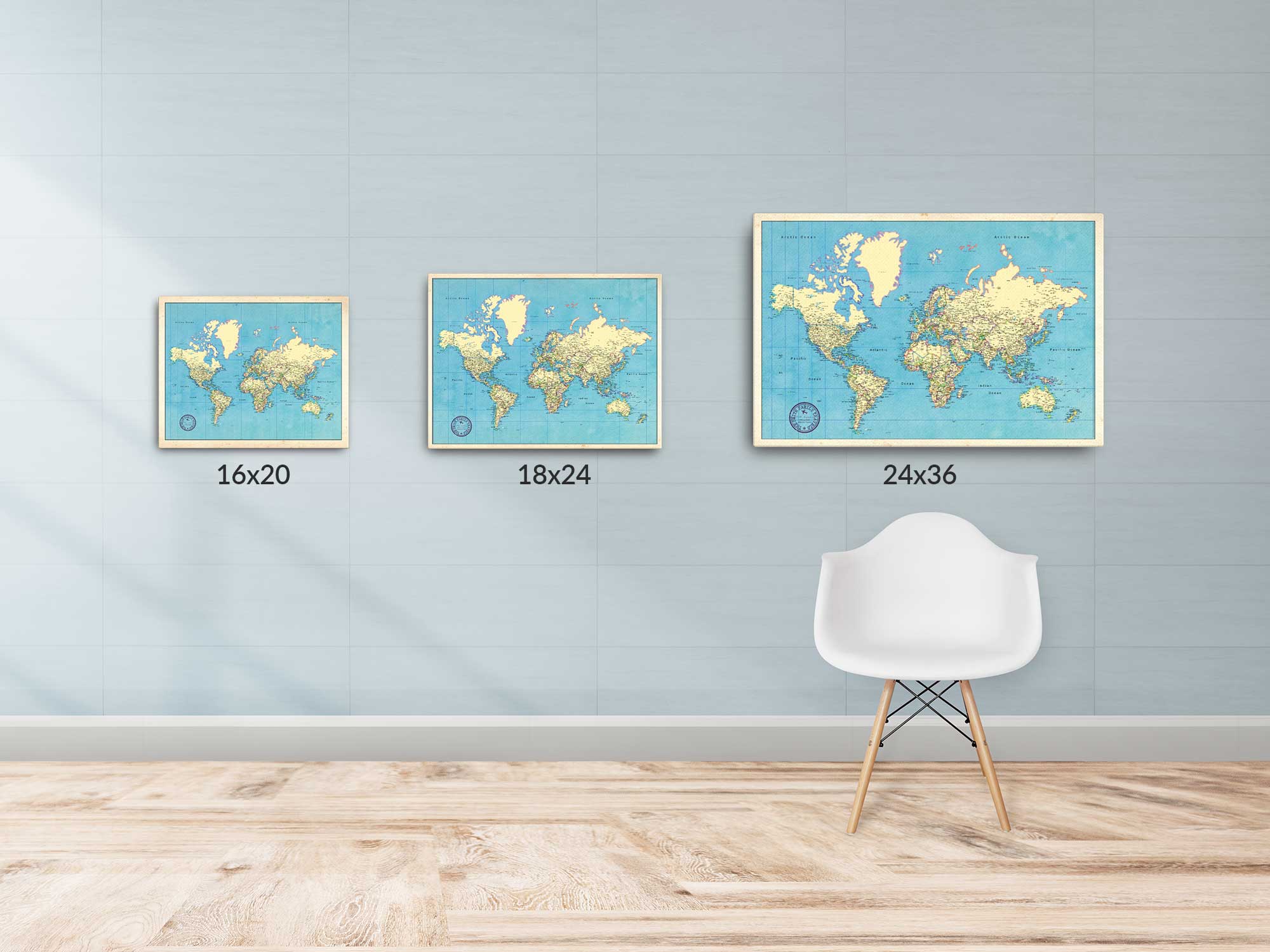 Shipped super quick! I got the largest option on canvas and the quality is fantastic. The cities are legible and the free pins is a nice touch.